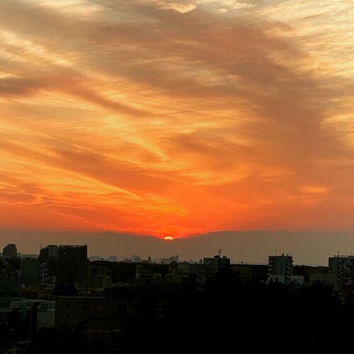 12月10日、16:21。太陽が地平線に沈んでいく瞬間。 これは1枚目の写真の約10秒後。 太陽はほぼ見えなくなった。 国立天文台によると、この日の「日没の時間」は 16:28。 「日没の時間」とは太陽の上縁が西の地平線の下に沈んだ瞬間のことだそうだ。 我が家…