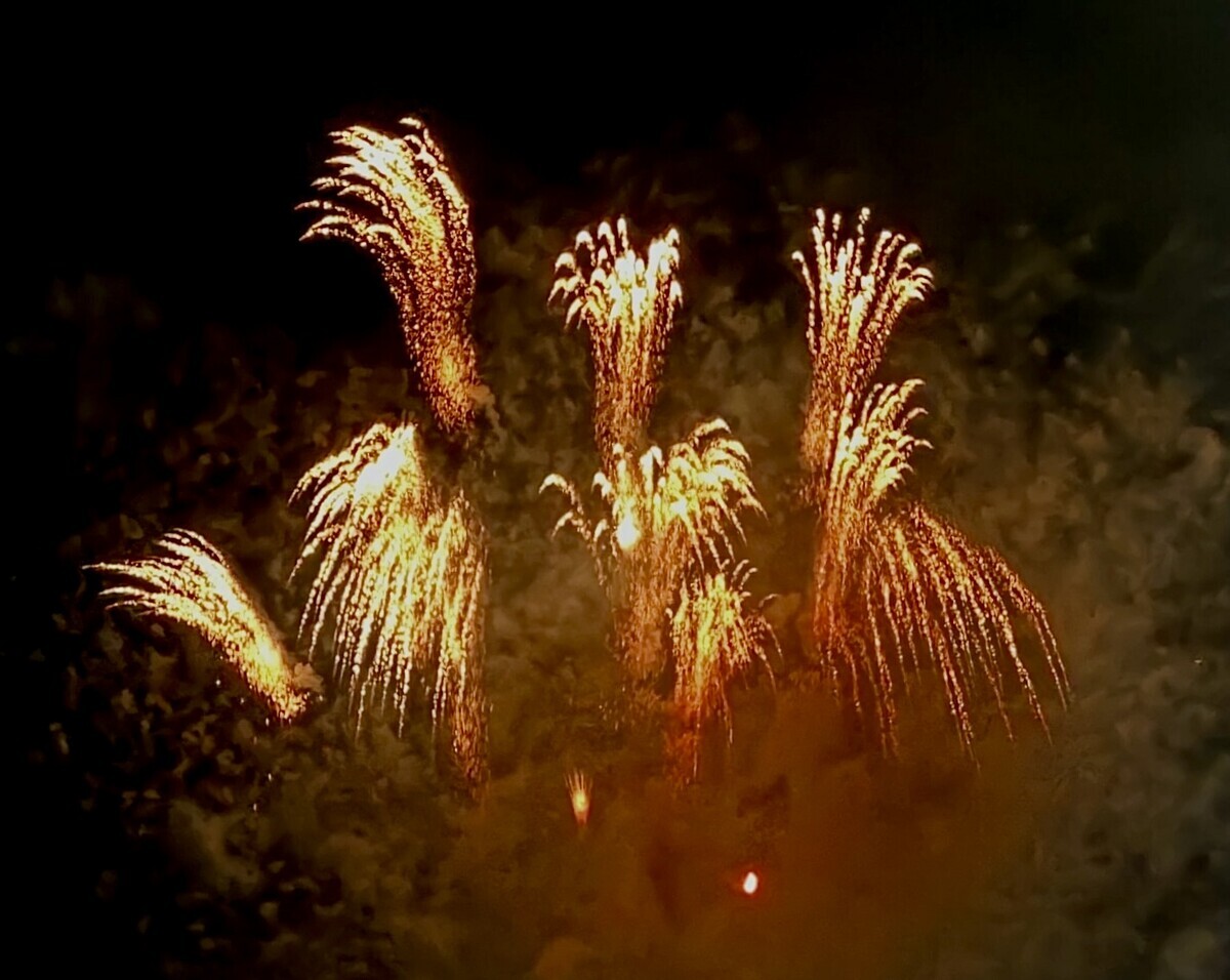 打ち上げ場所が以前のような国立競技場や軟式野球場ではなくて今回は神宮球場になったので、我が家からはバルコニーの手すりから身を乗り出すような角度をつけないとみえず、三脚使用はむずかしくいので手持ちで撮影となった。よってBULB(シャッター速度の解放)はなしで長い尾をひいたような花火写真はろれず。それに今夜の天候は靄っていて、シャープな景観でもなくて撮影日和ではなかったので数枚撮影しただけ。